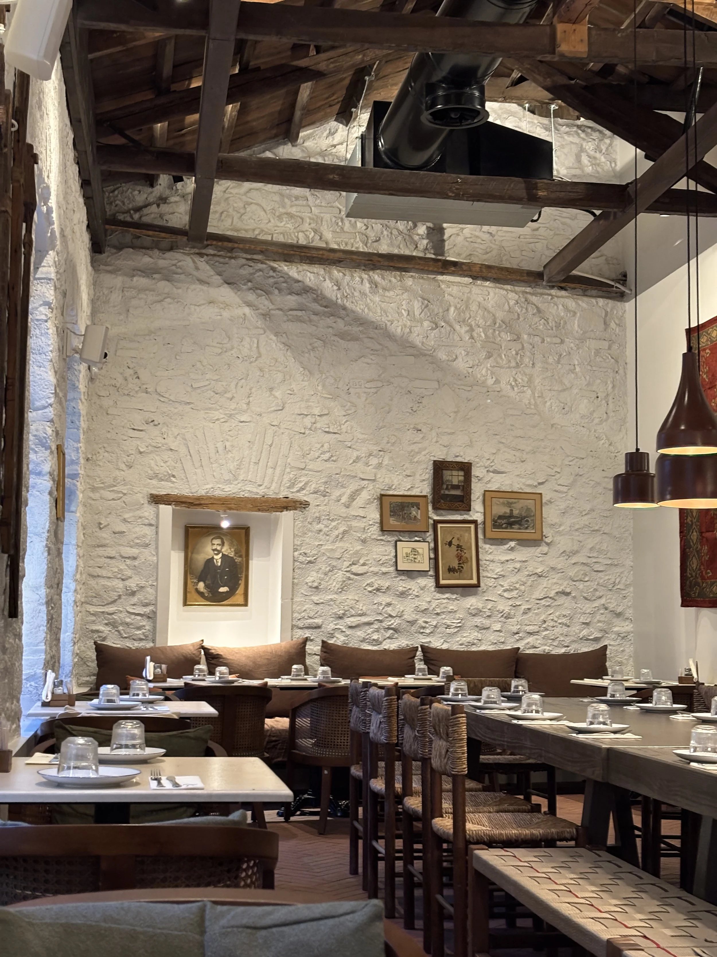 The restaurant occupies a beautifully renovated neoclassical building dating back to 1845. The interior design retains the building's original stone walls and wooden beams, creating a warm and inviting atmosphere. An olive tree stands at the center of the dining area, evoking the feel of a traditional village square. Cinapos offers a menu that celebrates traditional Greek cuisine with influences from Constantinople.